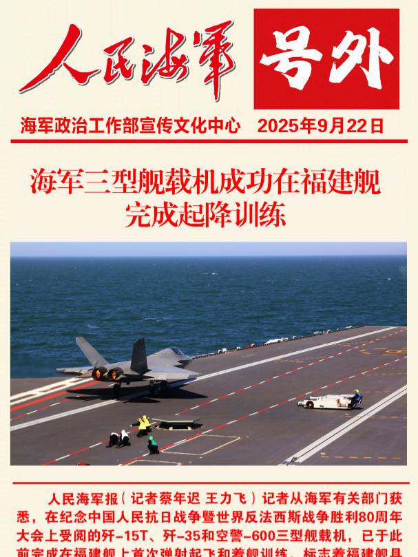 記者從海軍有關(guān)部門(mén)獲悉,在紀念中國人民抗日戰爭暨世界反法西斯戰爭勝利80周年大會(huì )上受閱的殲-15T、殲-35和空警-600三型艦載機,已于此前完成在福建艦上首次彈射起飛和著(zhù)艦訓練,標志著(zhù)福建艦具備了電磁彈射和回收能力。這是我國航母發(fā)展歷程中取得的又一次突破,對推進(jìn)海軍轉型建設具有里程碑意義。